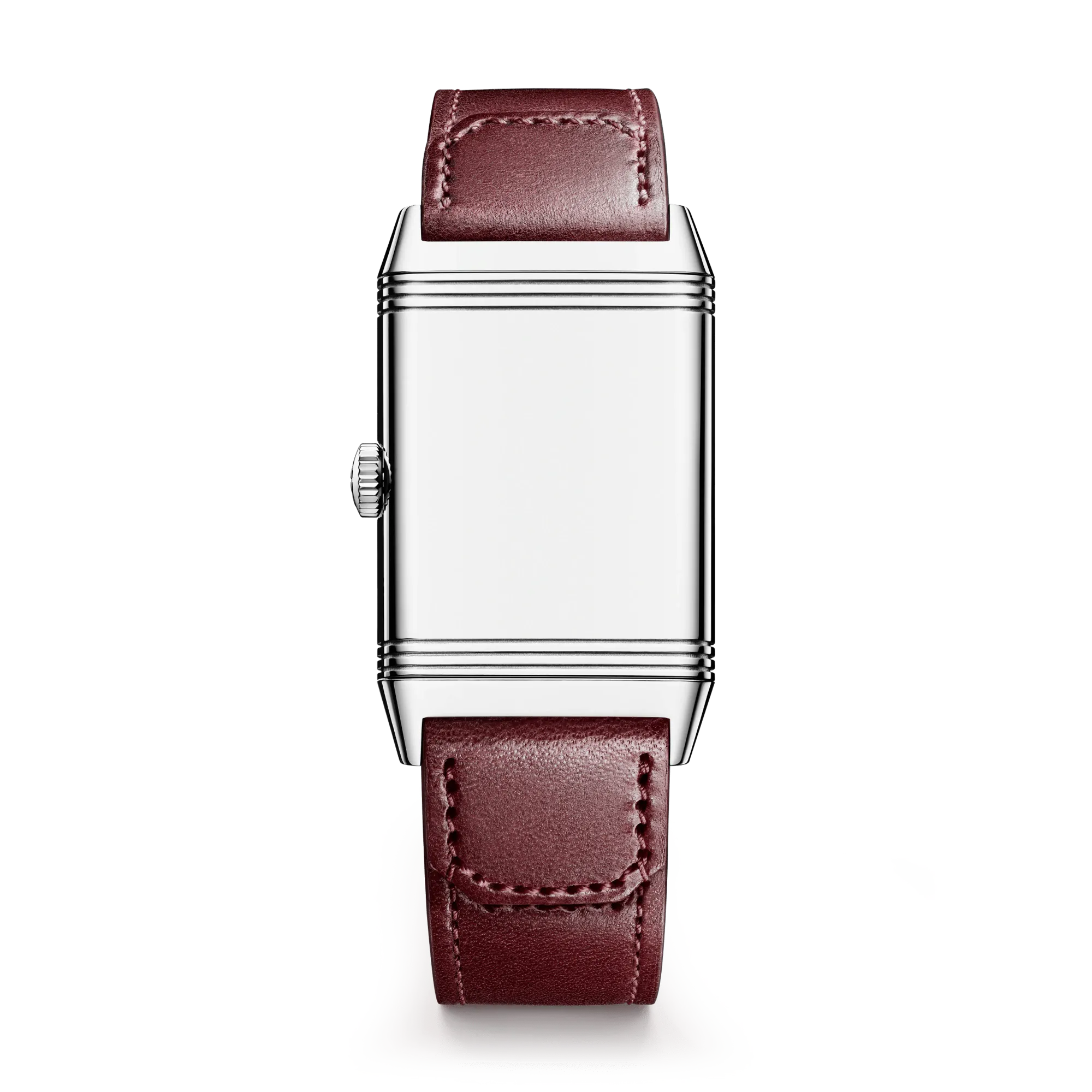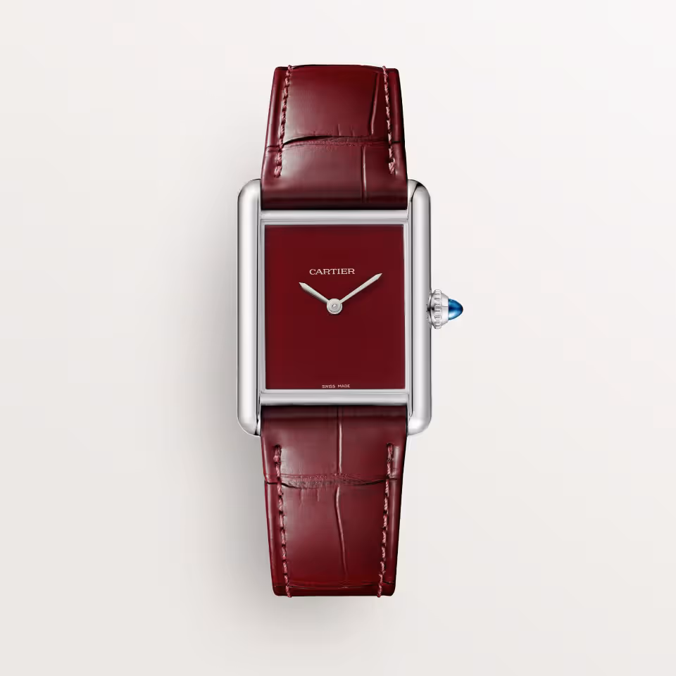 Décrite par Cartier comme lie-de-vin (c’est plus chic que “bordeaux” mais il y a probablement une petite différence de teinte sur le champ chromatique allant du rouge au violet), la couleur du cadran de cette Tank s’accorde parfaitement à celle du bracelet ce qui nous rappelle également pourquoi on considère parfois que Cartier a “inventé” la montre-bracelet pour homme : avant eux, l’harmonie entre ces deux éléments n’était peut-être pas aussi parfaite.