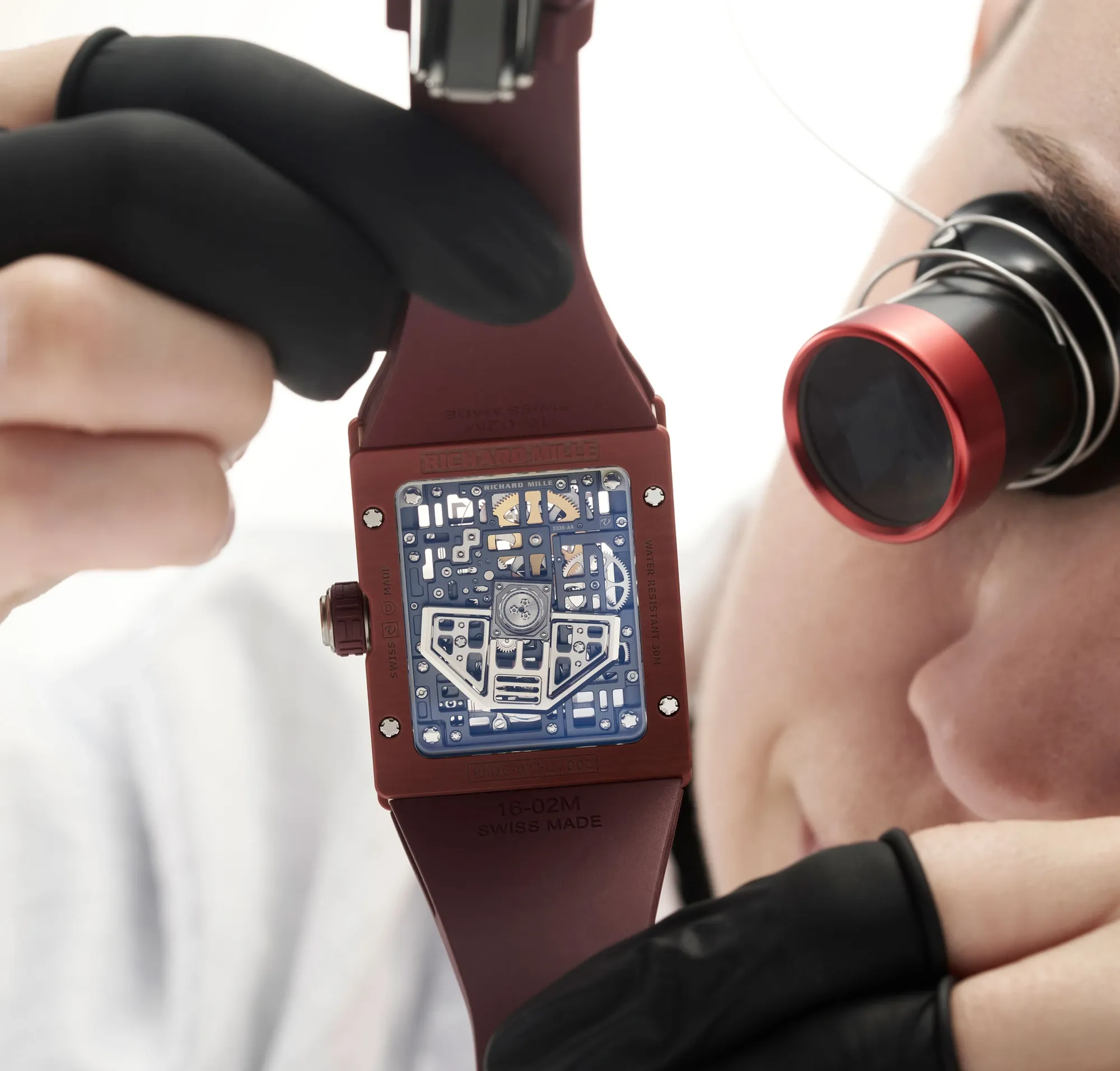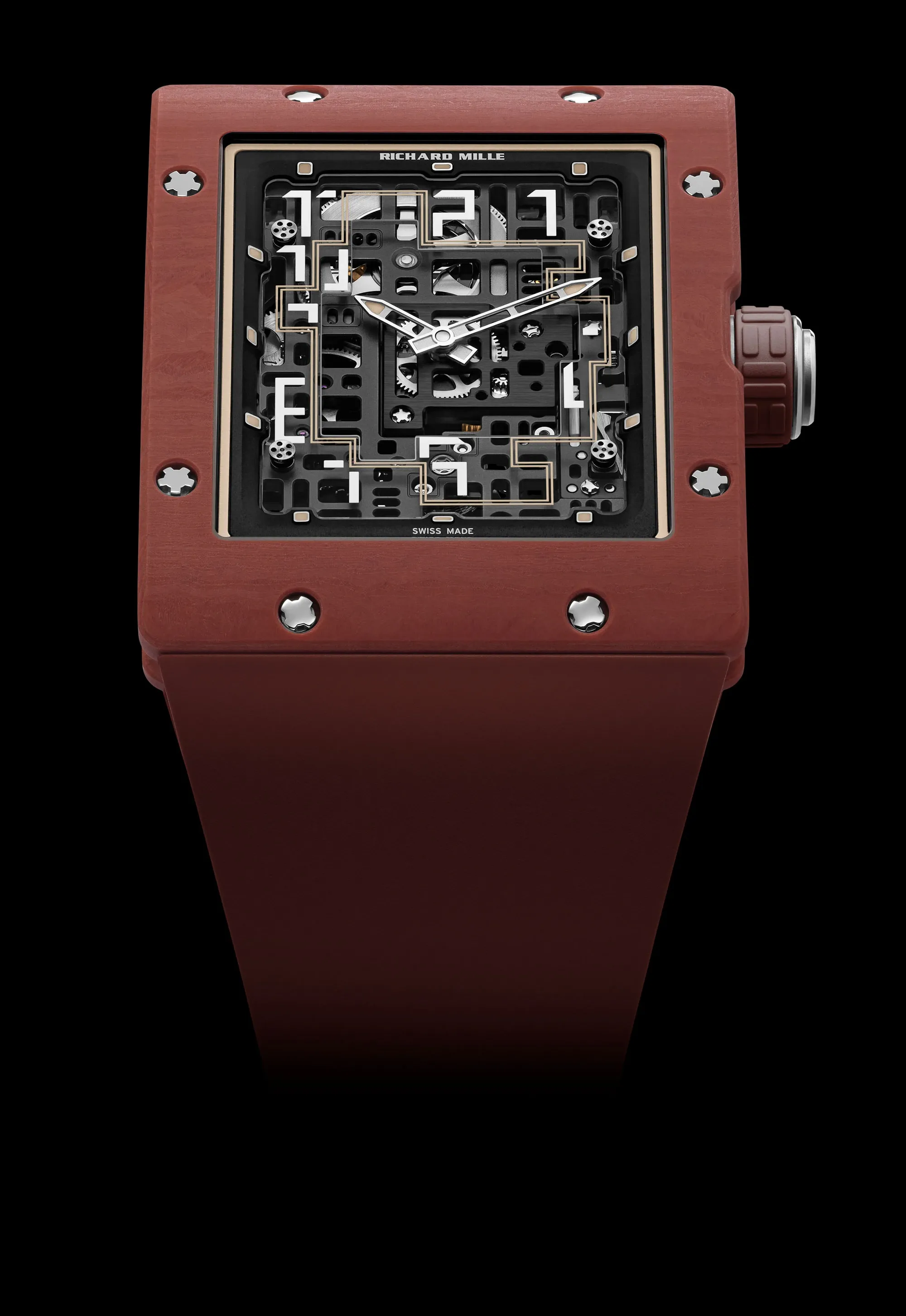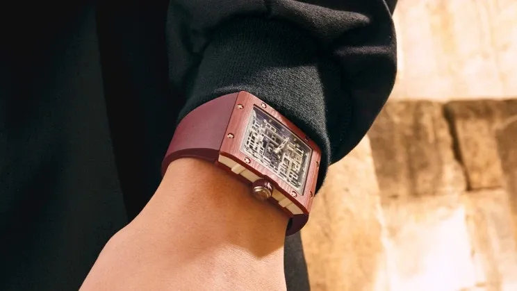 Certes, le cahier des charges n’est pas tout à fait respecté car le cadran de cette montre n’est pas bordeaux étant donné qu’il s’agit d’un modèle squelette, mais le reste de la montre l’est et met en valeur cette déclinaison d’un modèle de montre Richard Mille dont la marque décrit le style comme brutaliste. Néanmoins, la douceur de ce choix de couleur la rend tout sauf brutale.