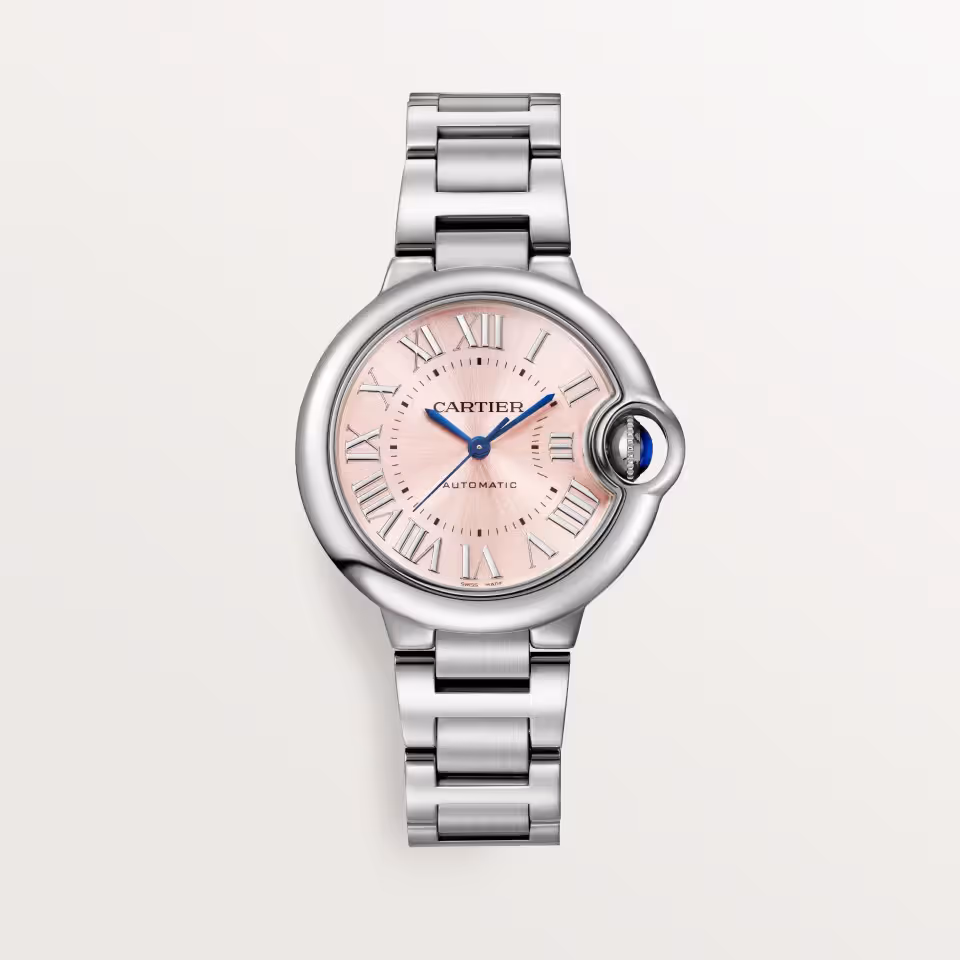 Au-delà du saisissant contraste des aiguilles bleues sur le fond rose qui donne beaucoup de charme à cette montre, on aime beaucoup l’idée de pouvoir la surnommer “Ballon Rose de Cartier”.