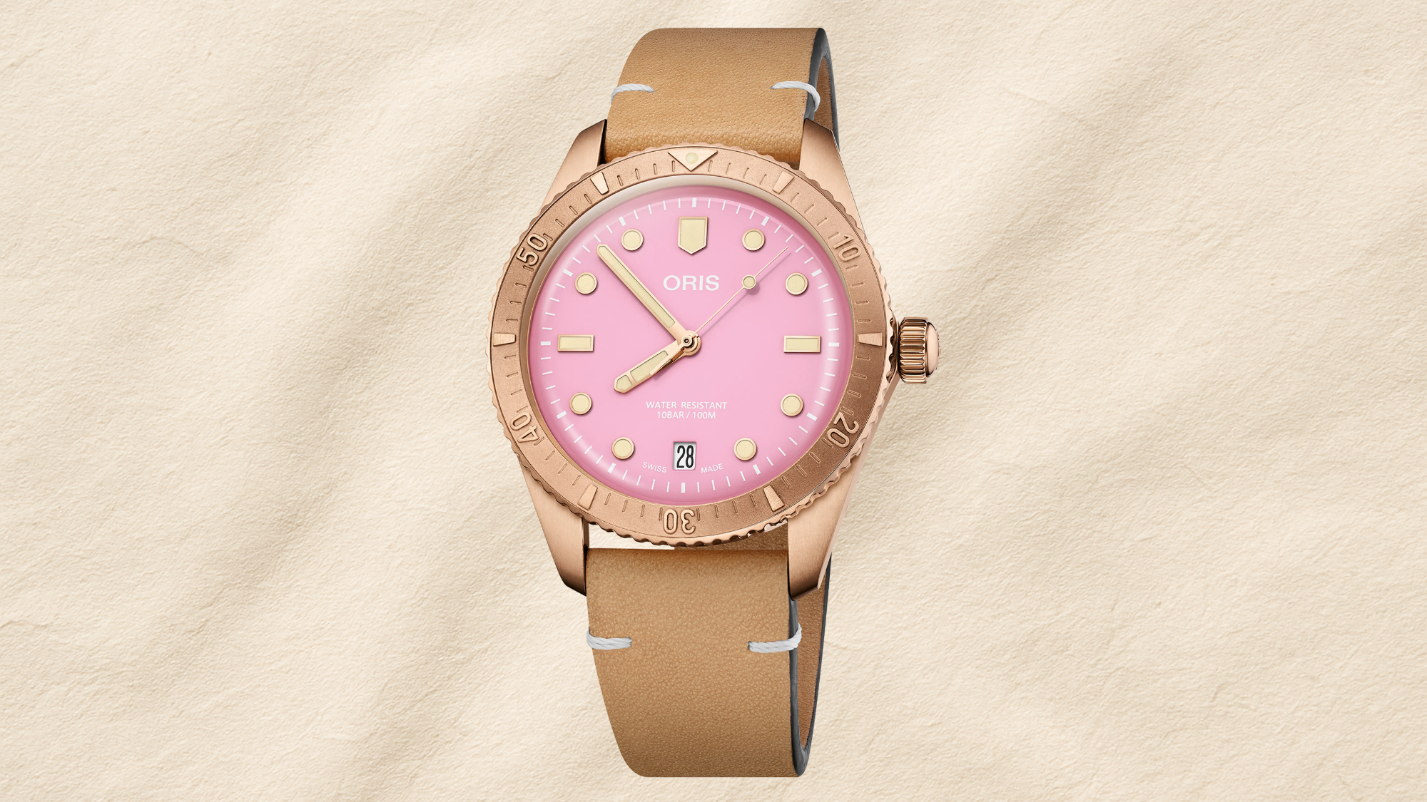 Autre combinaison pro-rose qui mérite le coup d’œil : celle du bronze et d’un cadran rose comme sur cette montre de plongée signée Oris. Une idée au moins aussi fun que son doux surnom de “cotton candy” alias “barbe à papa” en français.