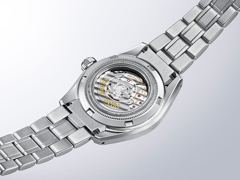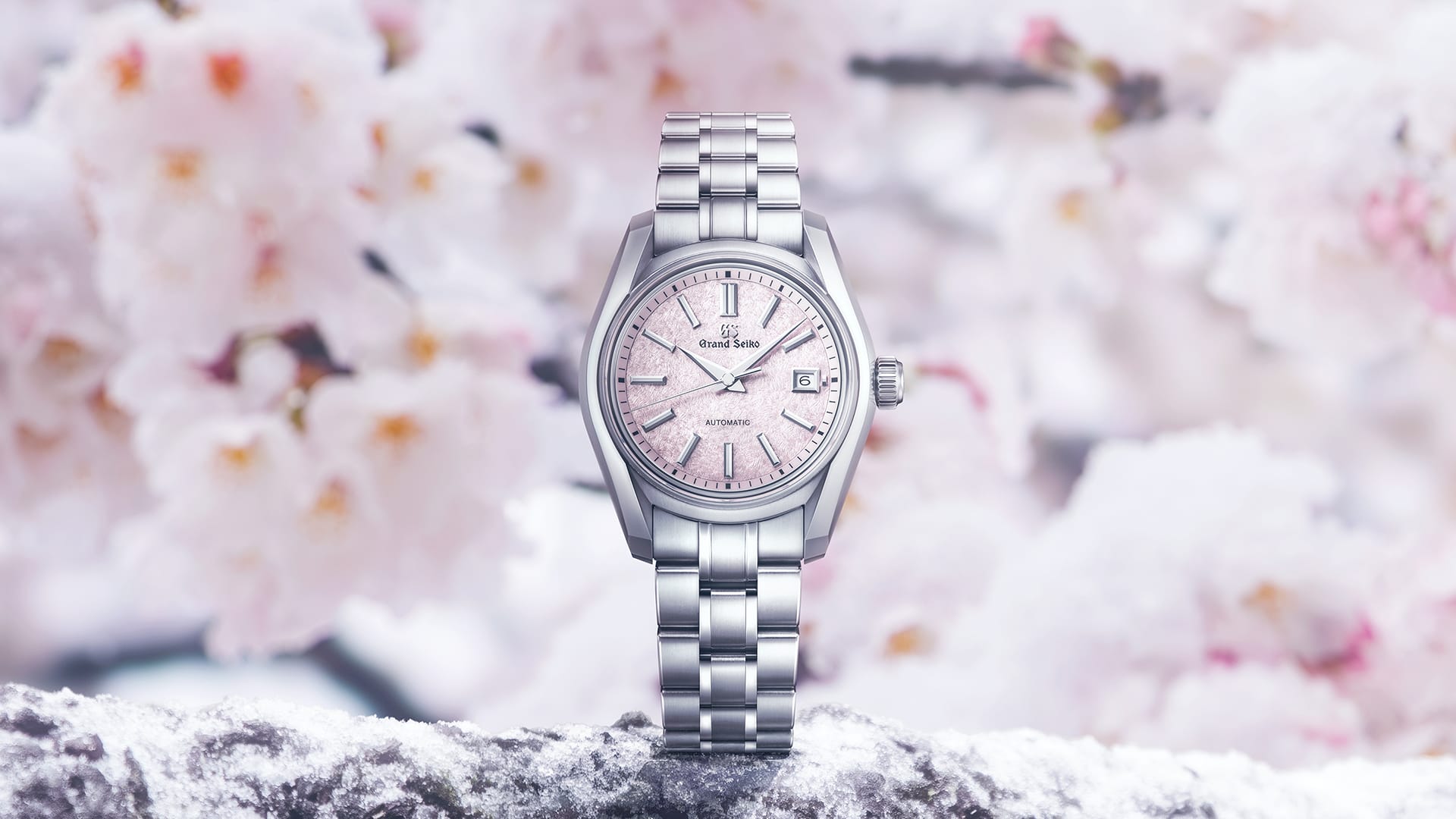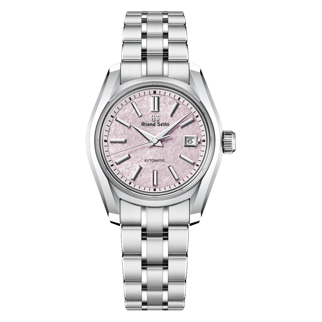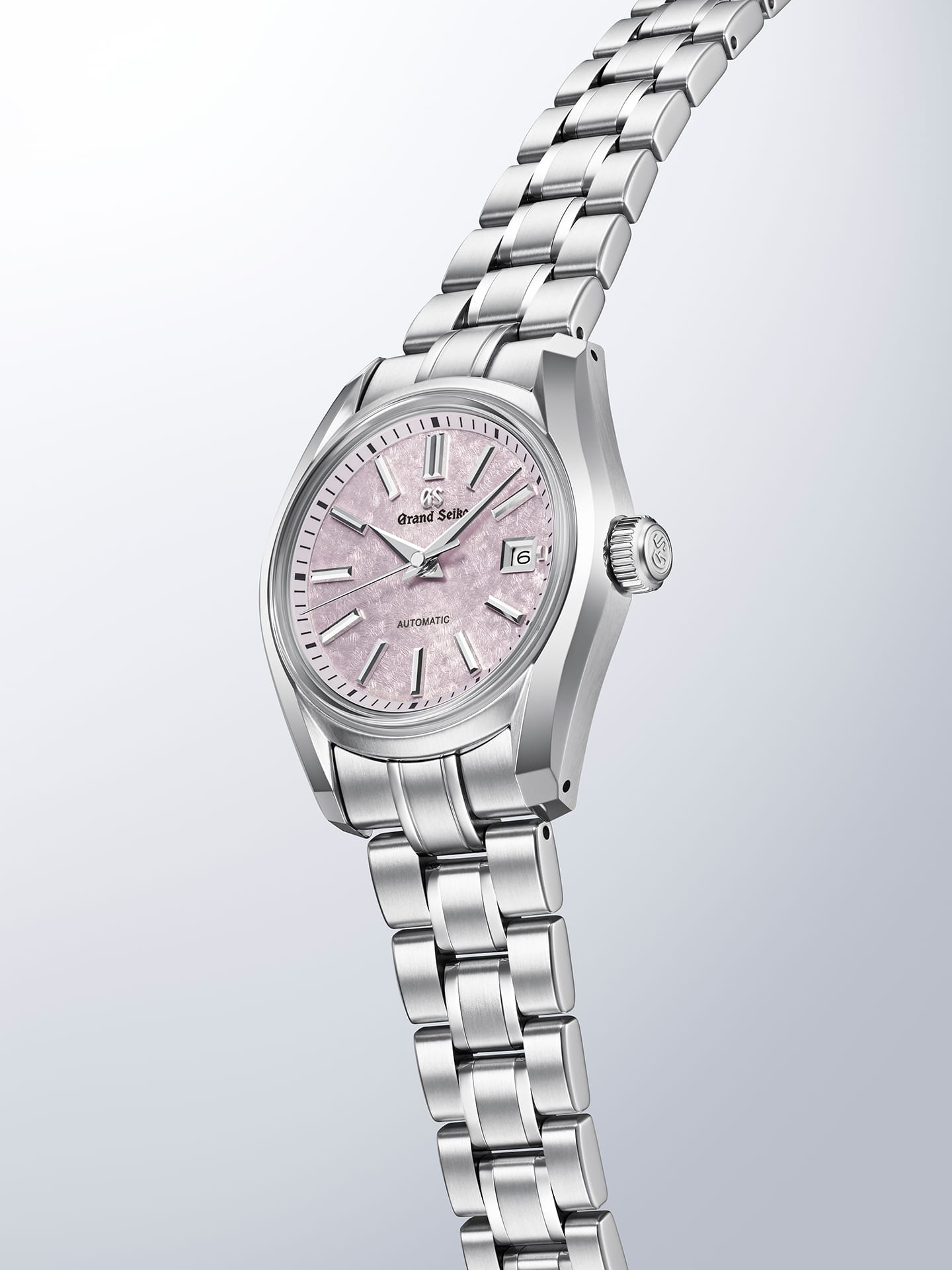 Le rose, c’est aussi la couleur des cerisiers en fleurs, un symbole printanier dont on connaît l’importance au pays du Soleil-Levant. Plus poétique encore, Grand Seiko explique que le cadran de cette montre s’inspire du “sakura-kakushi”, un phénomène au cours duquel les cerisiers en fleurs se cachent délicatement sous une couche de neige.
