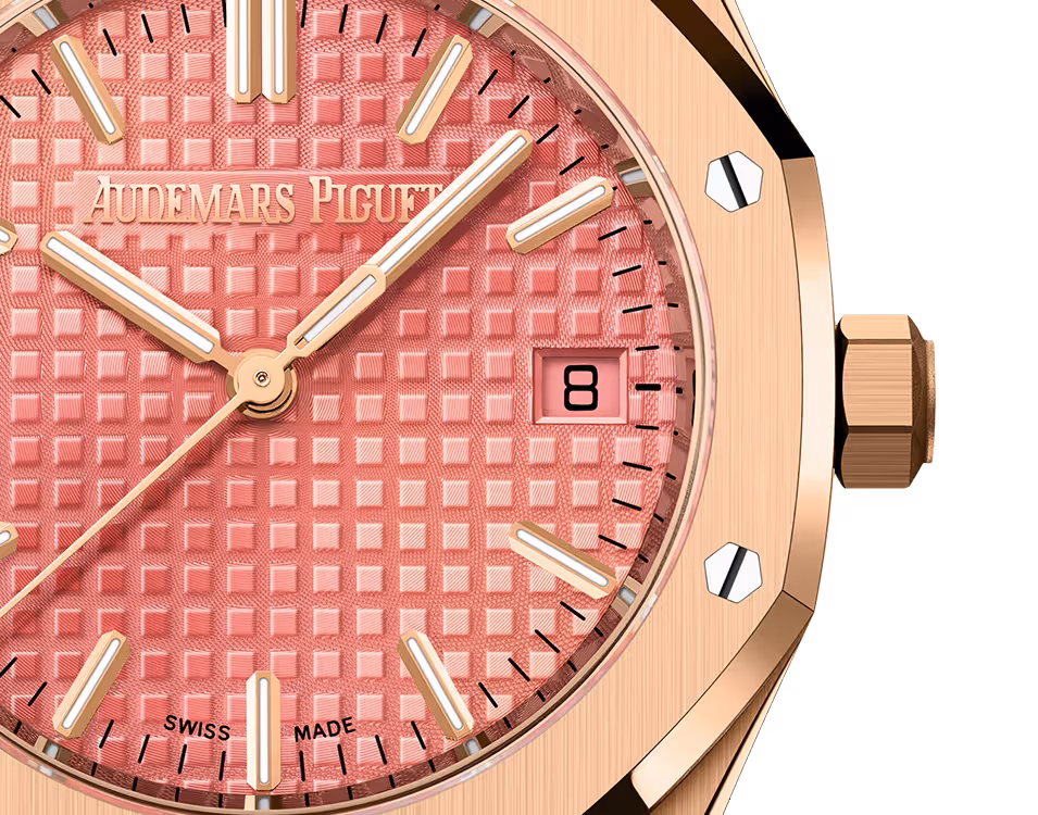 Au-delà du cadran, l’or rose est peut-être la façon la plus répandue de porter cette teinte en horlogerie sans en avoir l’air. Ici, le geste est davantage revendiqué : le cadran, les aiguilles, le boîtier et le bracelet forment un camaïeu de rose dénotant plus d’intention tout en restant subtil.