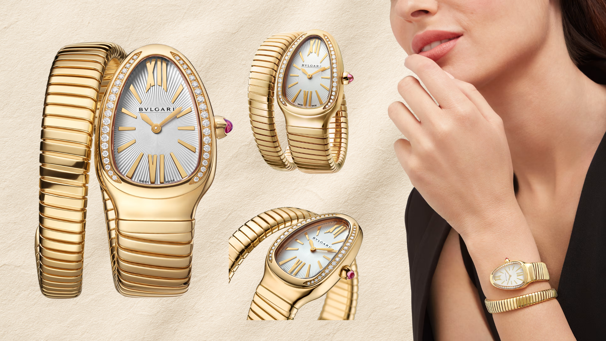 Véritable sculpture portable, cette montre au bracelet à tours multiples en forme de serpent, l’une des signatures de Bvlgari, utilise également la technique Tubogas qui consiste à enrouler des rubans d’or de façon à ce qu’ils prennent forme sans soudure. Le genre de prouesse et de design qui font les créations intemporelles comme en témoigne le retour en force de ce design né dans les années 40.