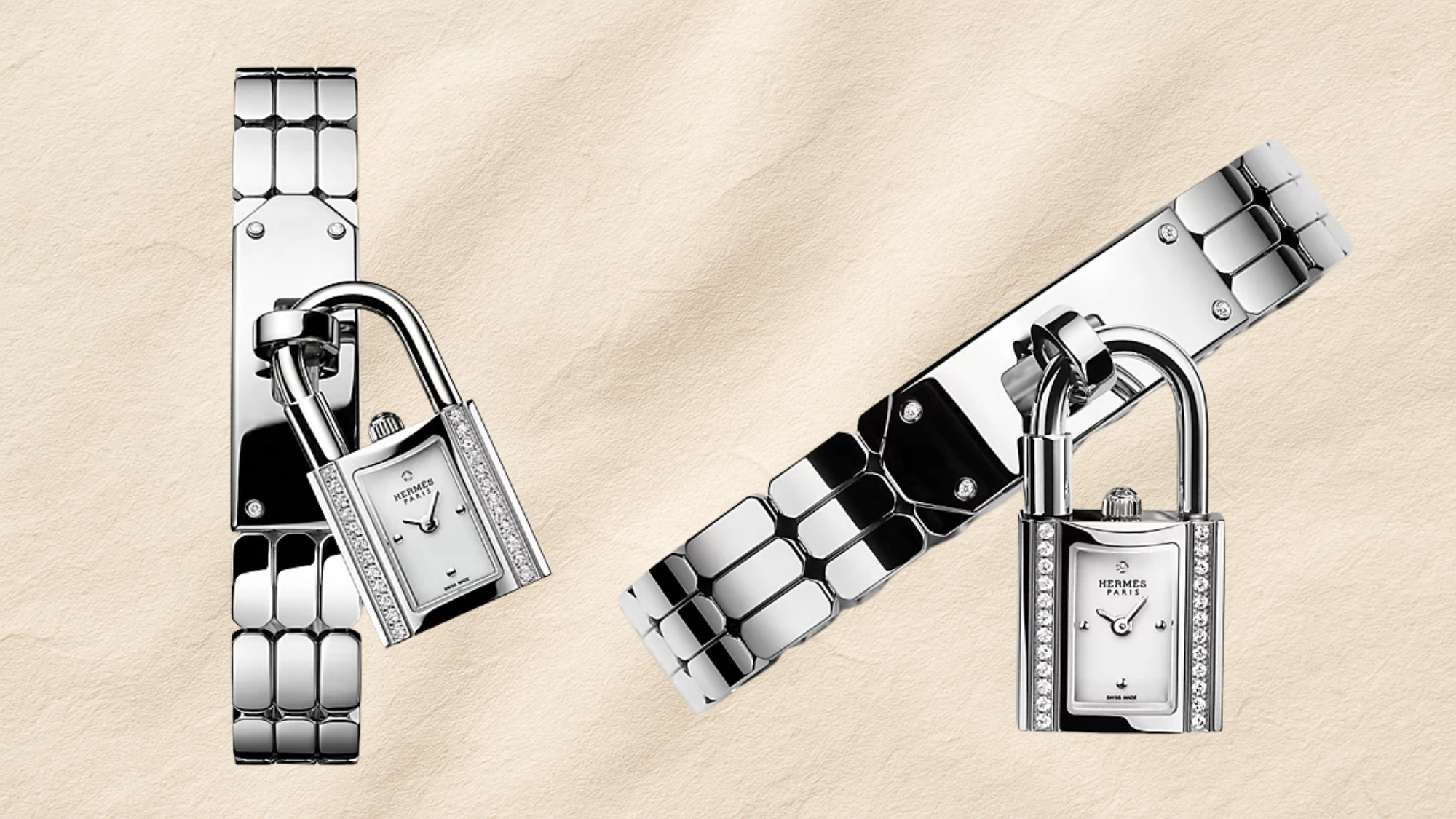 Inspirée du fermoir et du célèbre cadenas du sac dont elle porte le nom, cette montre en forme de cadenas peut être détachée de son bracelet pour être portée en pendentif, en porte-clés, voire les deux comme le suggère une photo d’illustration du site e-commerce d’Hermès où la montre est attachée à un collier clochette en cuir. Un hommage possible à Martin Margiela qui eut l’idée de reprendre cette enveloppe de cuir destinée à abriter les clés et cadenas des sacs pour en faire un collier, mais aussi celle du bracelet à double tour de la montre Cape Cod.