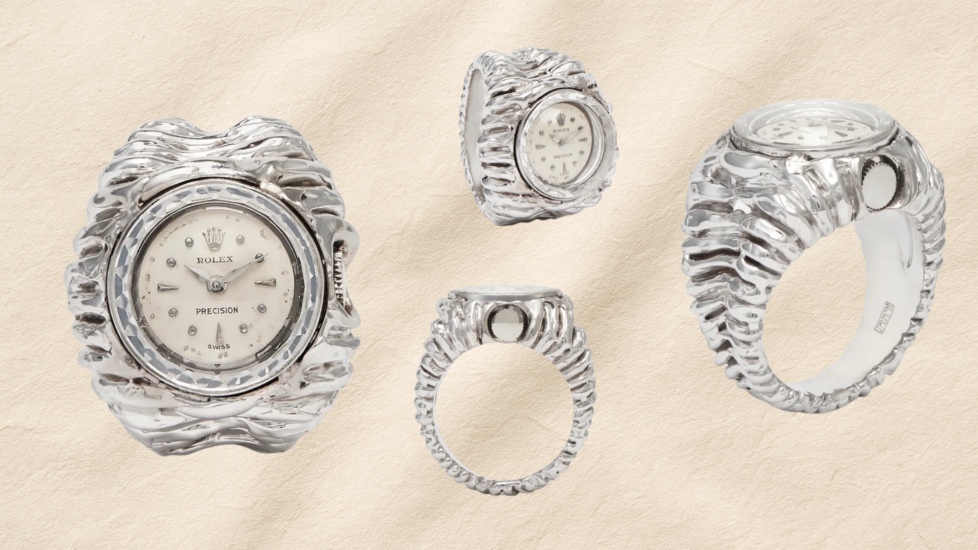 Créatrice originaire de Thaïlande, Patcharavipa Bodiratnangkura fabrique des bijoux mais aussi des montres customisées. À l’intersection entre les deux univers et pile dans la tendance du moment, cet anneau en or blanc caractéristique de l’esthétique de la marque enserre un boîtier de montre Rolex Precision vintage pour créer une pièce d’horlogerie unique et non conventionnelle.