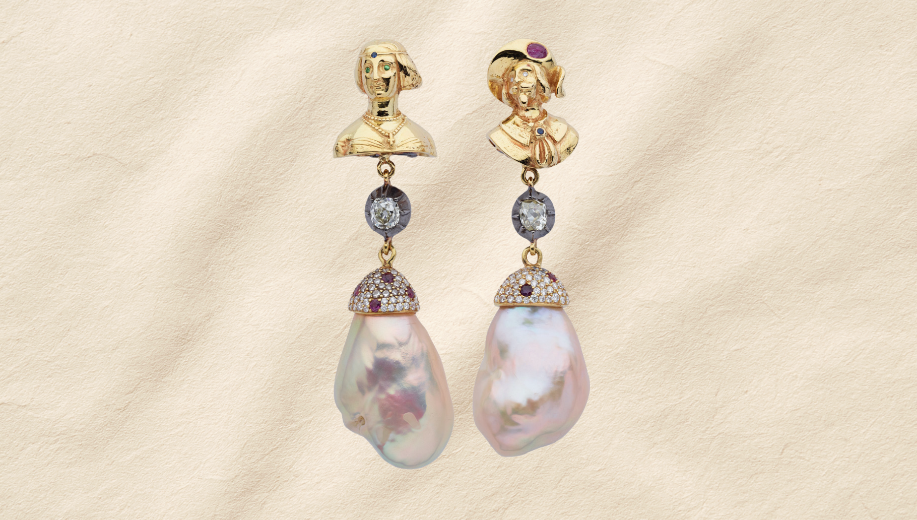 En voilà des boucles d’oreilles qui réunissent histoire et joaillerie. La créatrice française Sylvie Corbelin y représente une certaine Mademoiselle de Chartres, habillée à la mode du XVIème siècle. Son front ? Orné d’une ferronnière, ce bijou de tête caractéristique de la Renaissance. Une perle presque baroque complète le bijou, faisant ainsi référence aux matériaux en vogue à l’époque de l’intrigue.