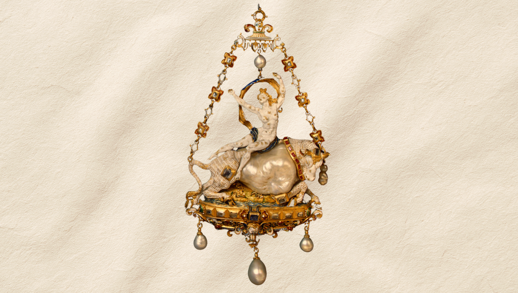 Un taureau et une jeune femme sur son dos. Sur ce pendentif Art déco, Alfred André met en scène l’une des histoires les plus connues des Métamorphoses : l’enlèvement de la princesse Europe par Zeus, qui prend alors la forme d’un taureau blanc. Une scène décrite avec une sensualité troublante par le poète latin, que l’on retrouve dans cette véritable œuvre d’art en or.