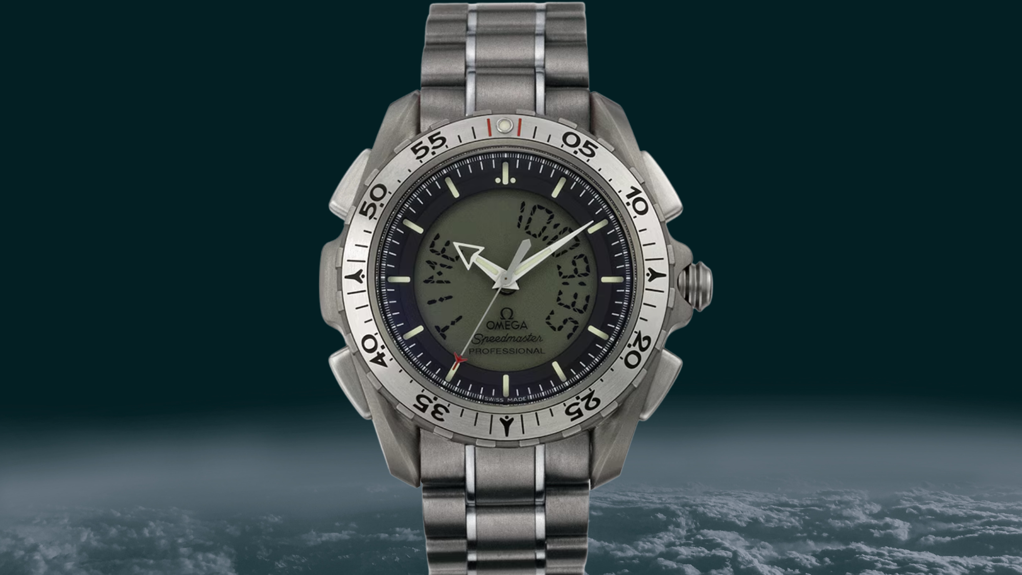 Conçue en 1998 (référence 3290.50) et suivie d’une deuxième génération (référence 3291.50.00) disponible pour le grand public entre 2001 et 2006, cette évolution de la Speedmaster (qui reçut la première homologation par la NASA en 1965 après avoir été portée une première fois lors de la mission Mercury de 1962) est équipée d’un mouvement à quartz alimentant un cadran à la fois analogique et digital.