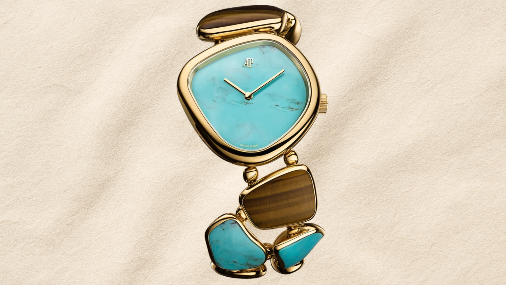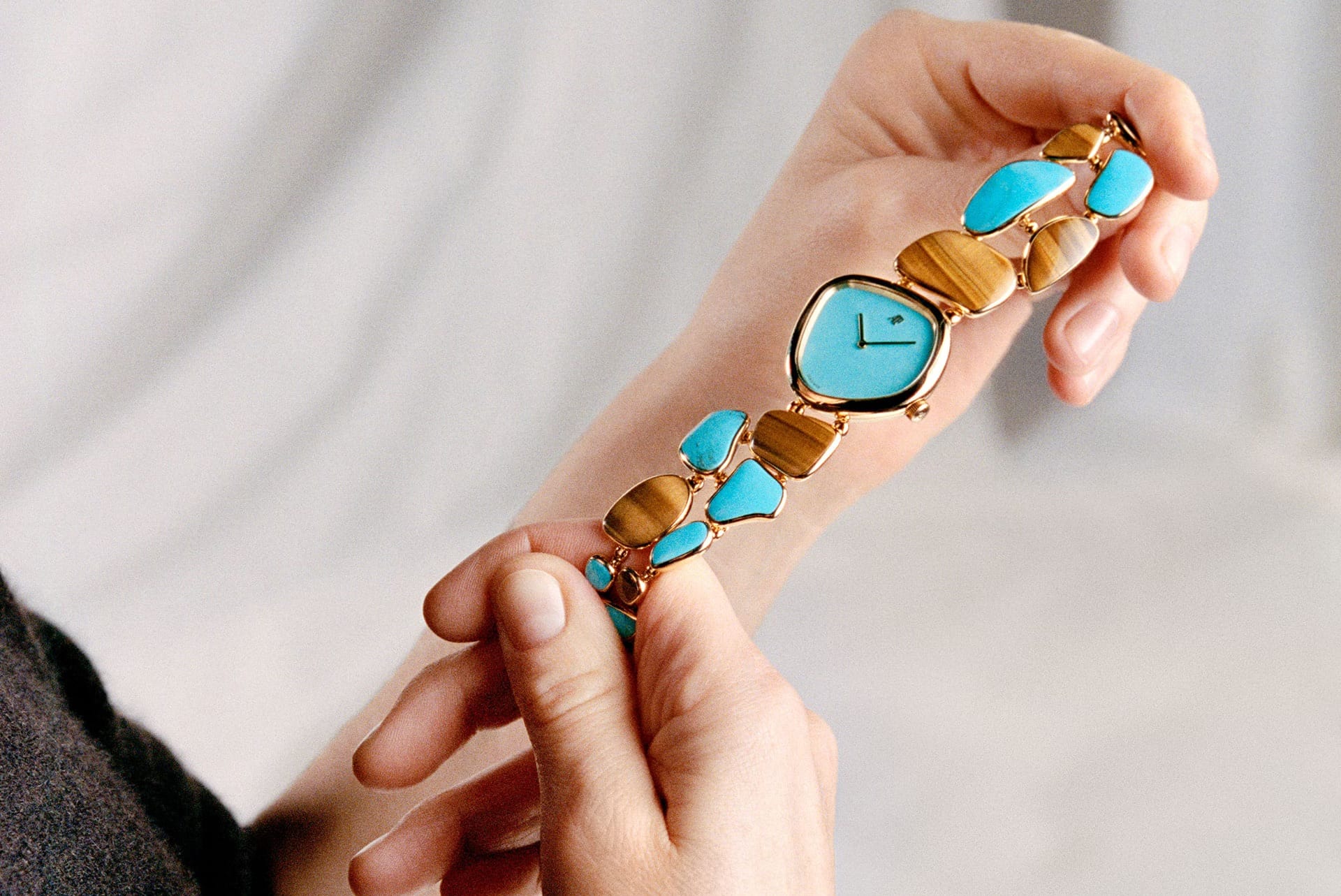 Avec ses maillons et son cadran en pierre naturelle en forme de galets, cette montre en or jaune équipée du Calibre 3098 (remontage manuel) et inspirée par le Lac de Joux a été réalisée grâce à la collaboration de plusieurs artisans. Aussi beau que le boîtier, chaque maillon du bracelet est travaillé individuellement avant d’être relié par des sphères d’or.