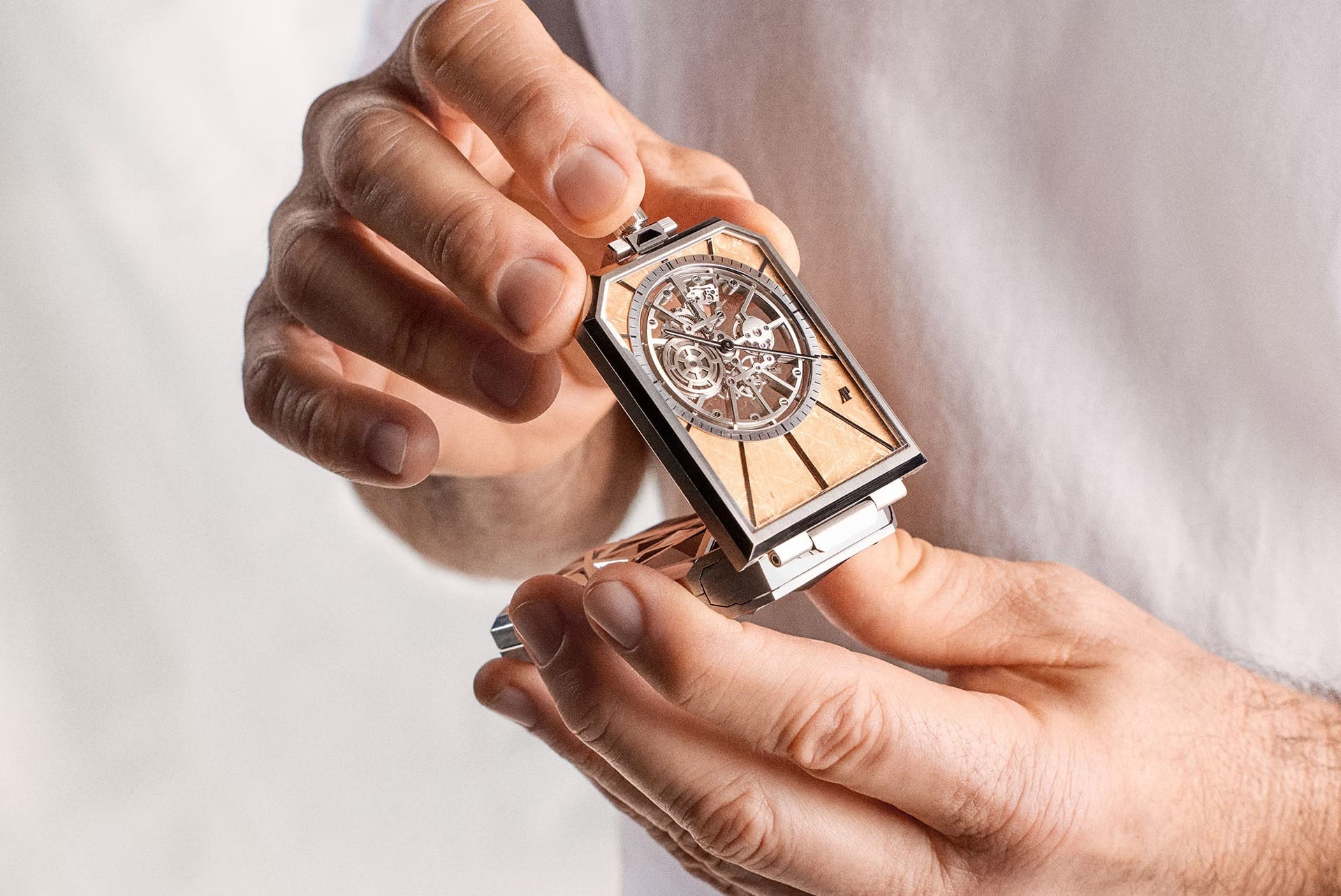 Montre de poche ou pendulette de table au gré des envies de son propriétaire, la montre Établisseurs Nomade s’ouvre via un double poussoir et un système de rail pour révéler un cadran en pierre naturelle et un mouvement squeletté à la main, le Calibre 7501 à remontage manuel dont les ponts ajourés servent également d’index. Une chaîne travaillée en titane ou en or vient compléter cette pièce nomade et précieuse.