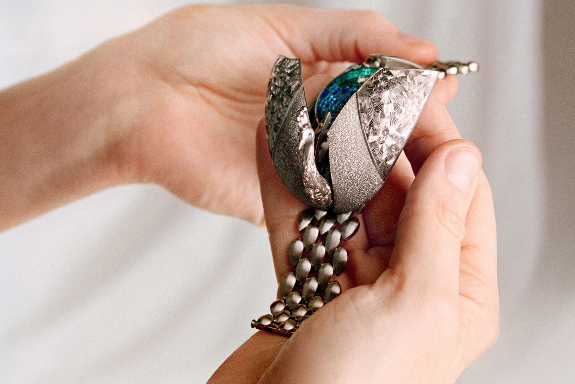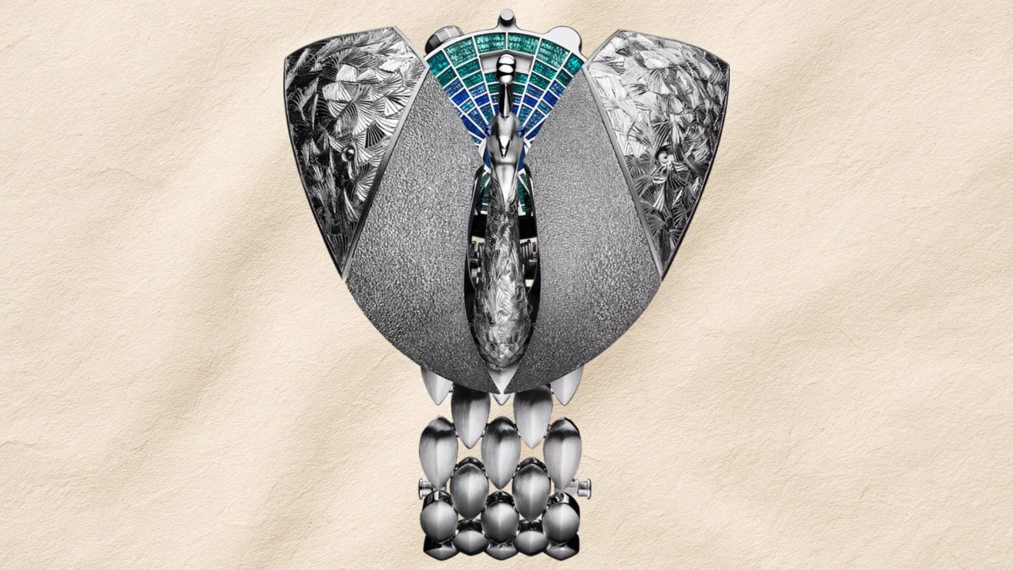 Mi-garde-temps mi-sculpture, cette montre à secret à heure traînante équipée du Calibre 3098.2 s’anime par un mécanisme d’automate révélant un paon miniature caché par les ailes d’un scarabée formées par la boîte en or gris. La roue de l’animal sert à lire l’heure mais aussi à faire impression avec un travail de gravure à la main et d’émaillage translucide.