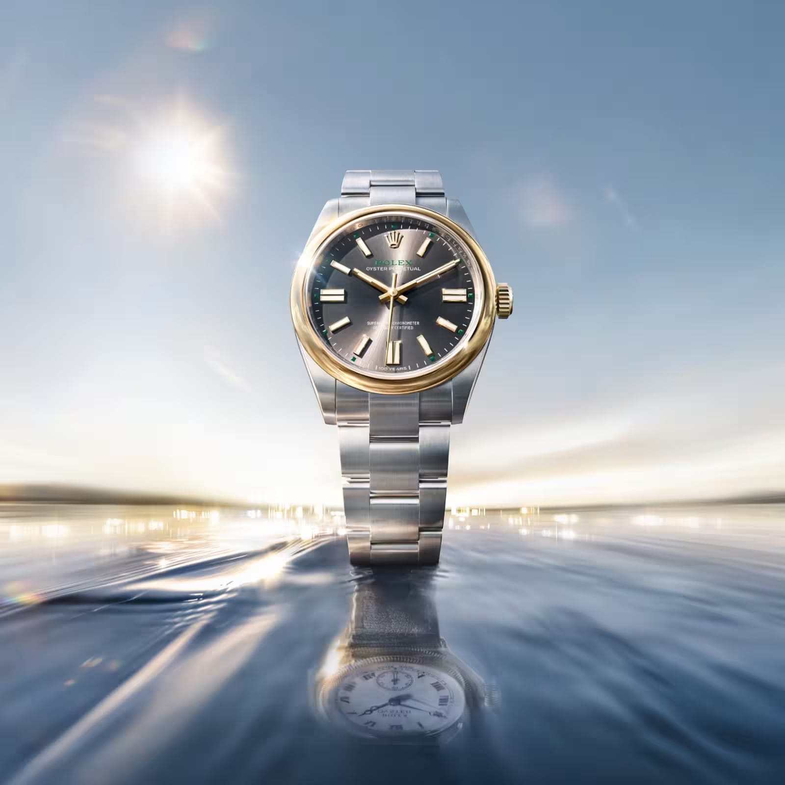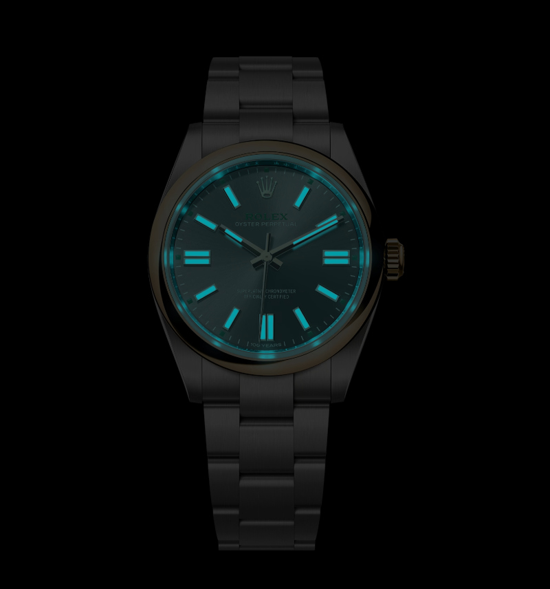 À commencer par l’Oyster Perpetual 41 en version Rolesor jaune pour la lunette et la couronne de remontoir tandis que le boîtier et le bracelet sont en acier Oystersteel. Une touche d’or qui constitue un clin d’œil aux premières Oyster. Édition anniversaire oblige, cette montre équipée du calibre 3230 comporte de nombreux signes distinctifs : le nombre 100 en relief sur la couronne de remontoir, la mention “100 years” à 6h sur le cadran, un carré vert à chaque intervalle de cinq minutes sur la minuterie et le nom “Rolex” également tampographié dans cette couleur signature.