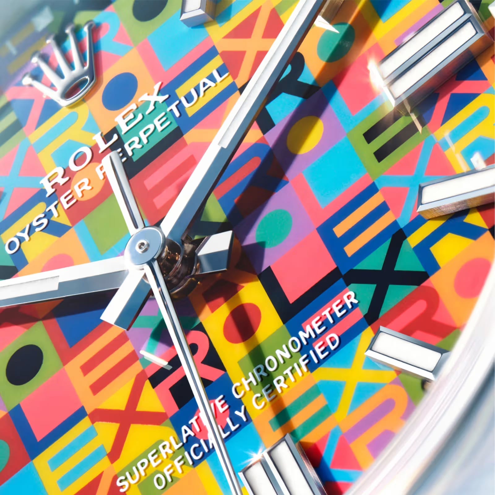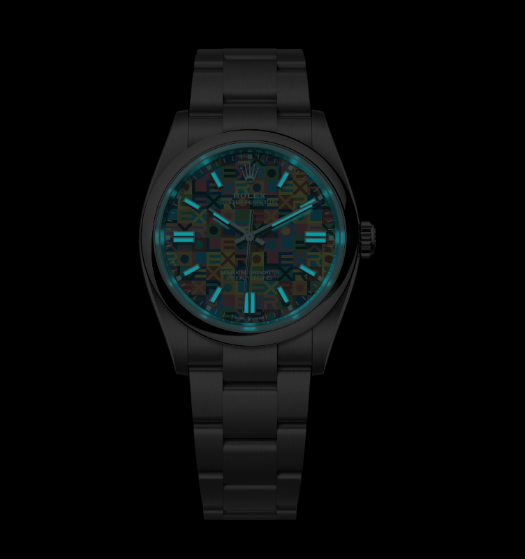 Le modèle 36mm se dote quant à lui d’un nouveau cadran qui réinterprète un décor appelé Jubilee, comme le fameux bracelet. Un jeu typographique avec les lettres qui forment le nom Rolex mais aussi avec dix teintes de couleurs qui sont appliquées l’une après l’autre, nécessitant une minutie probablement aussi extrême que l’assemblage des mouvements.