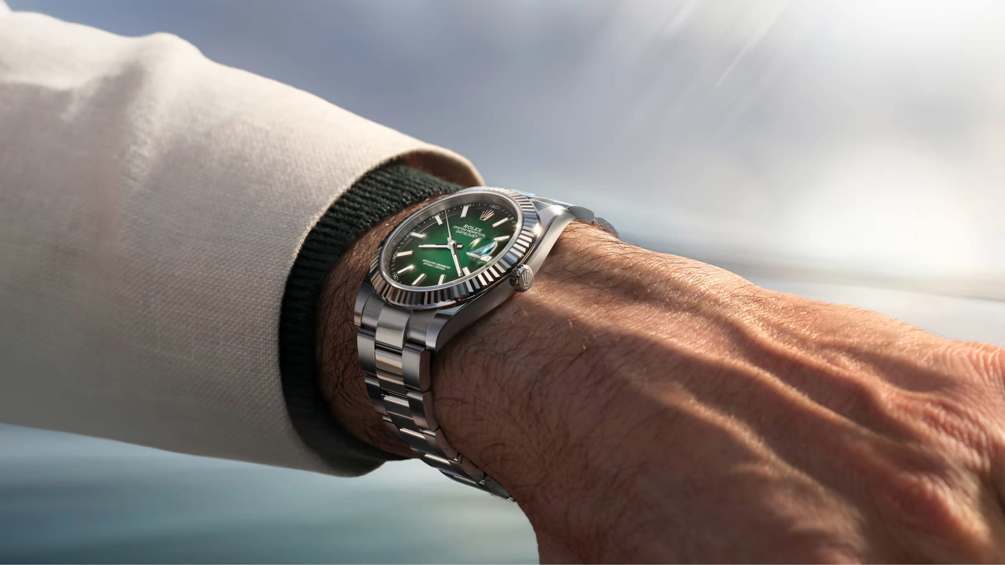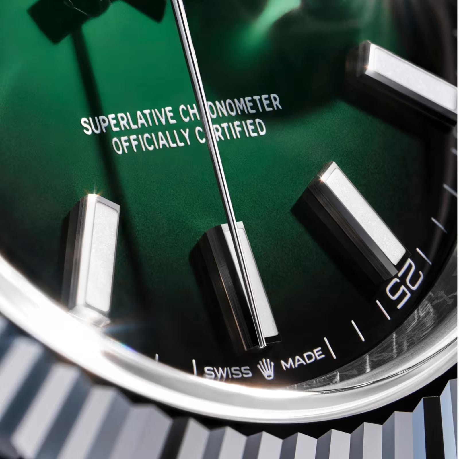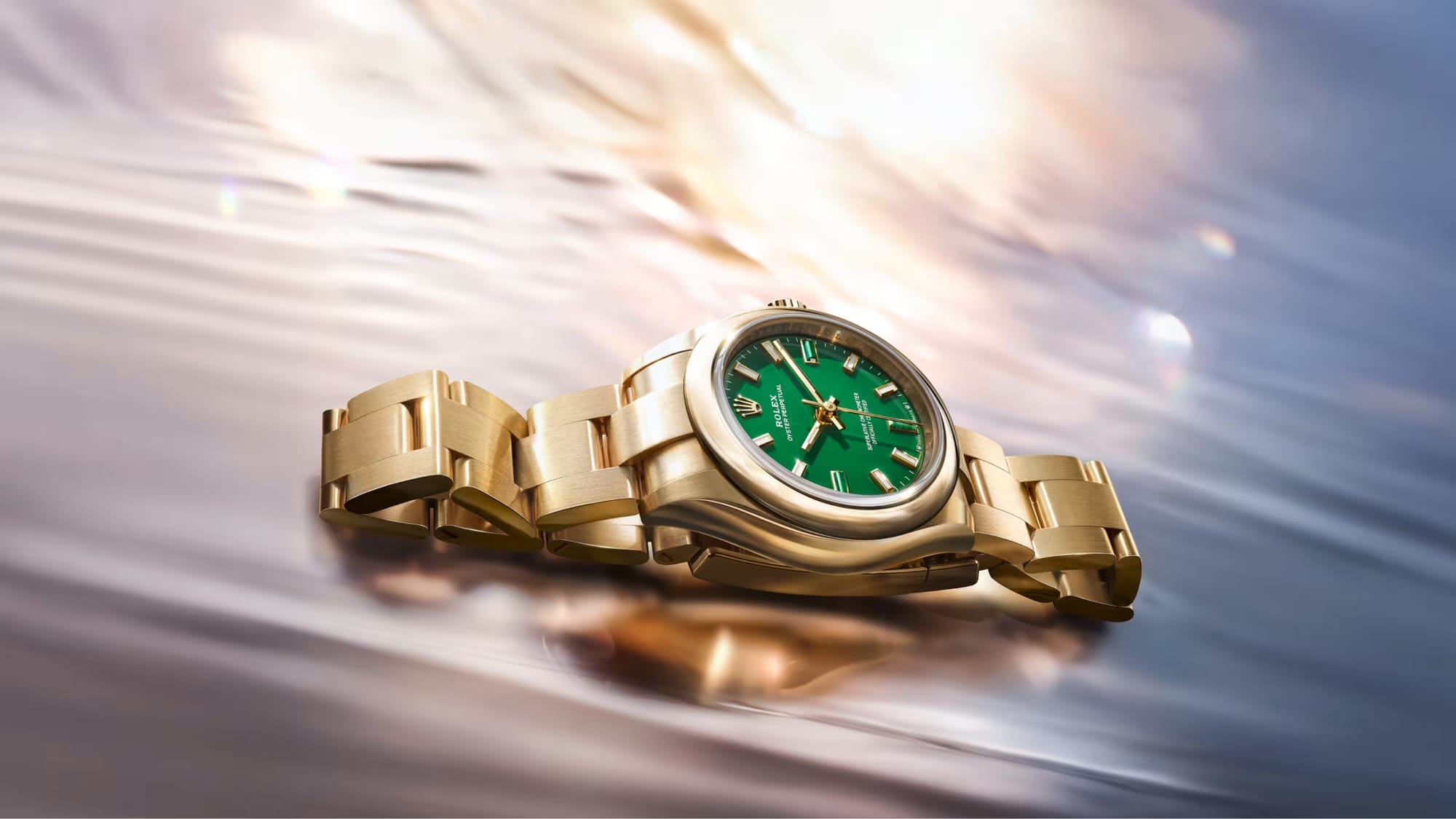 Développé et fabriqué par Rolex, l’alliage d’or Jubilee Gold 18 ct sert désormais à fabriquer une nouvelle version de l’Oyster Perpetual Day-Date 40 avec un cadran en aventurine vert clair choisi pour se marier avec l’éclat particulier du métal précieux.