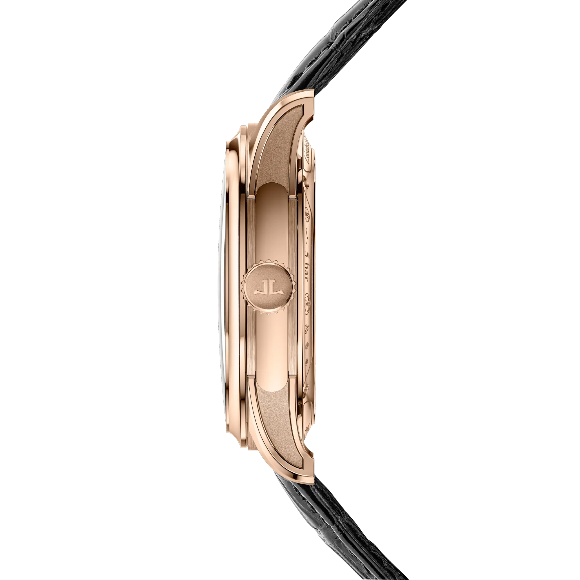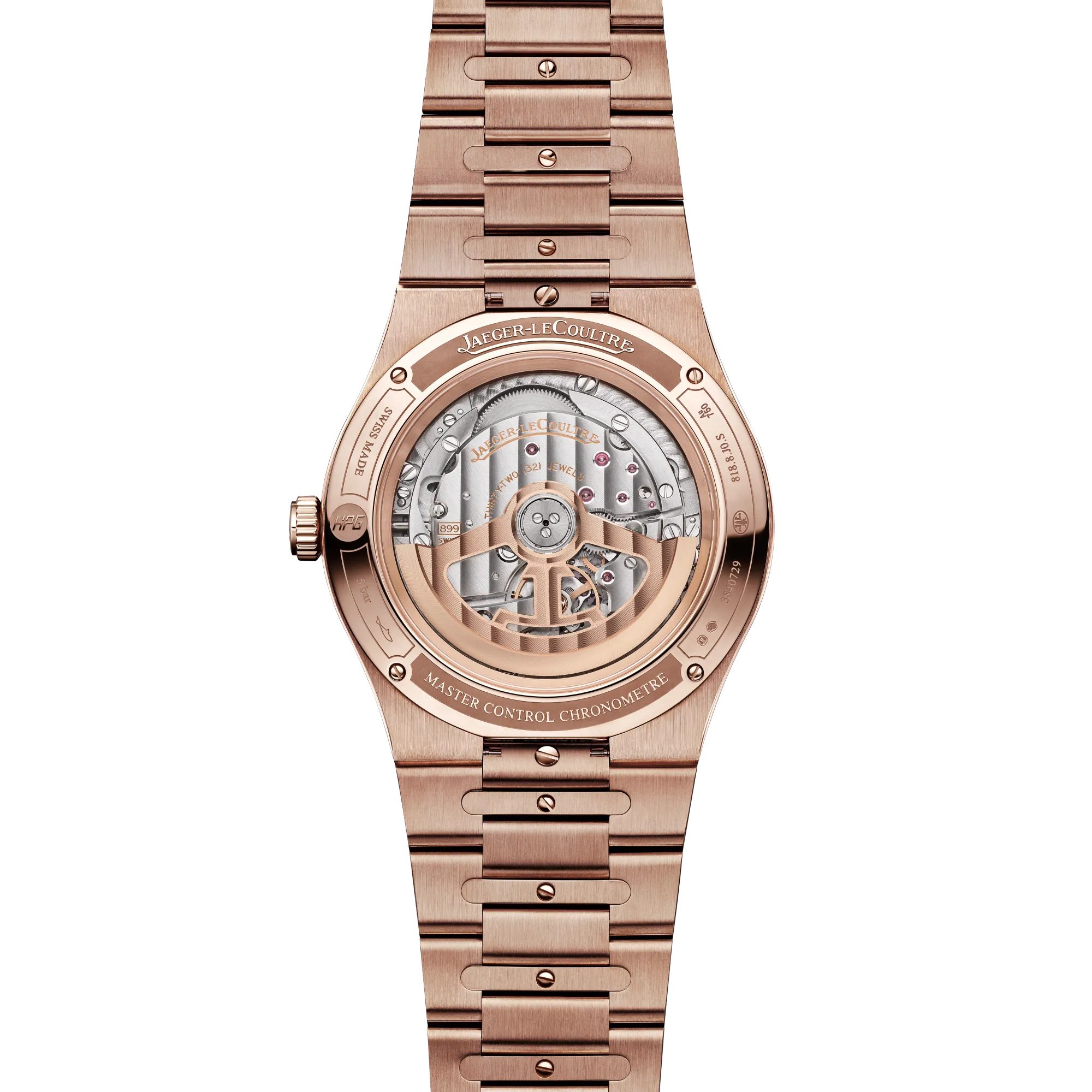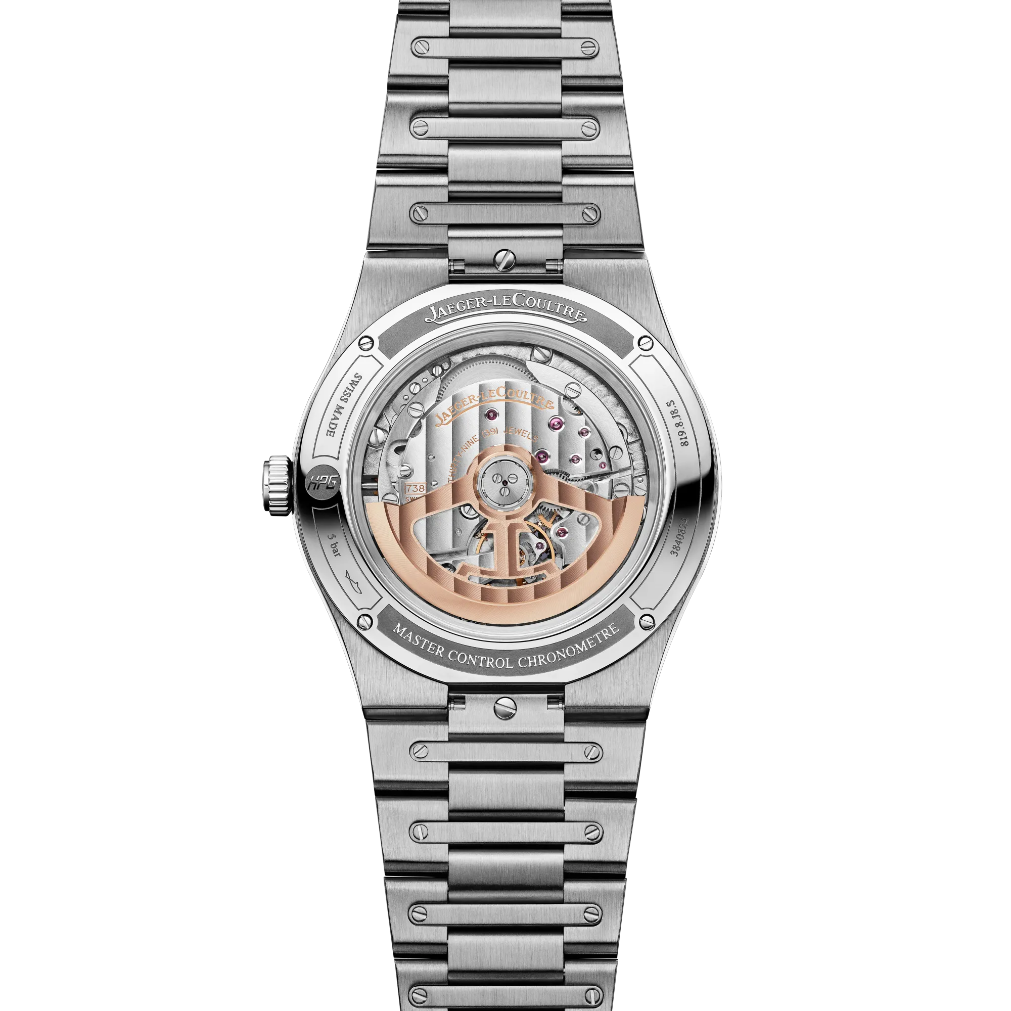 À peine plus grande avec son boîtier en acier de 39 mm, la Master Control Chronometre Date Power Reserve se distingue du modèle précédent grâce à son double agencement de compteurs (réserve de marche et affichage de date) inspiré de la Futurematic de 1951. Le Calibre 738 ultra fin dont le rotor en or rose 22 carats est visible sous son fond en verre saphir offre 70 heures de réserve de marche.