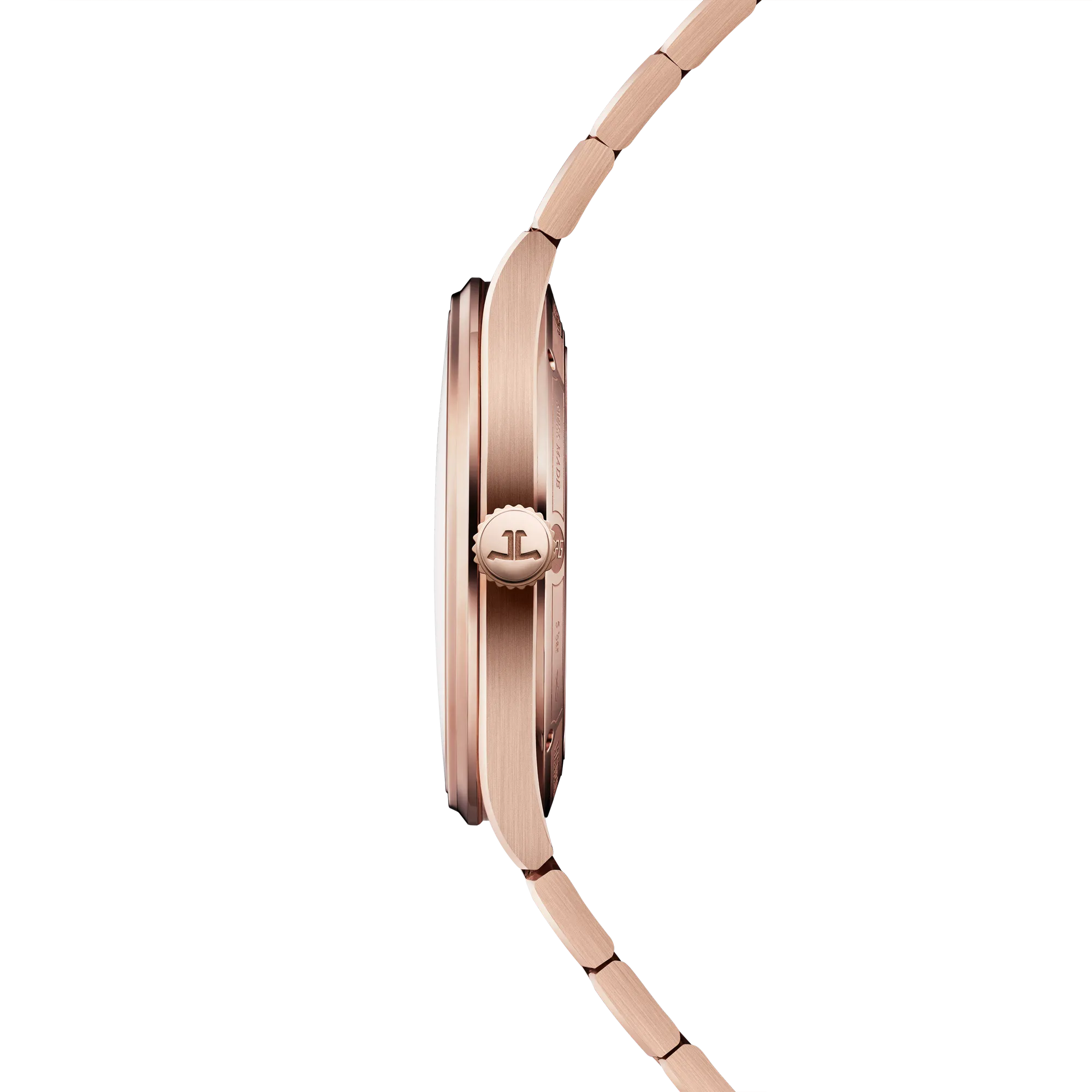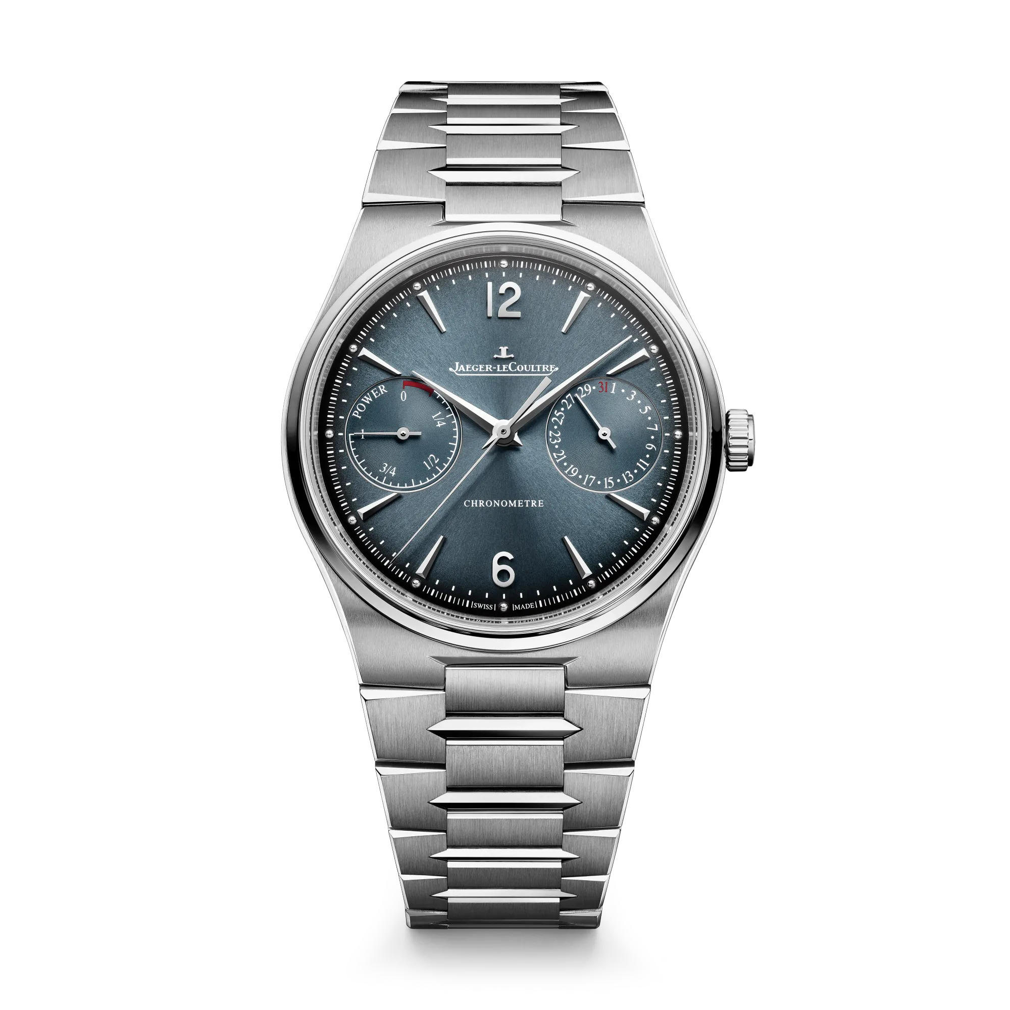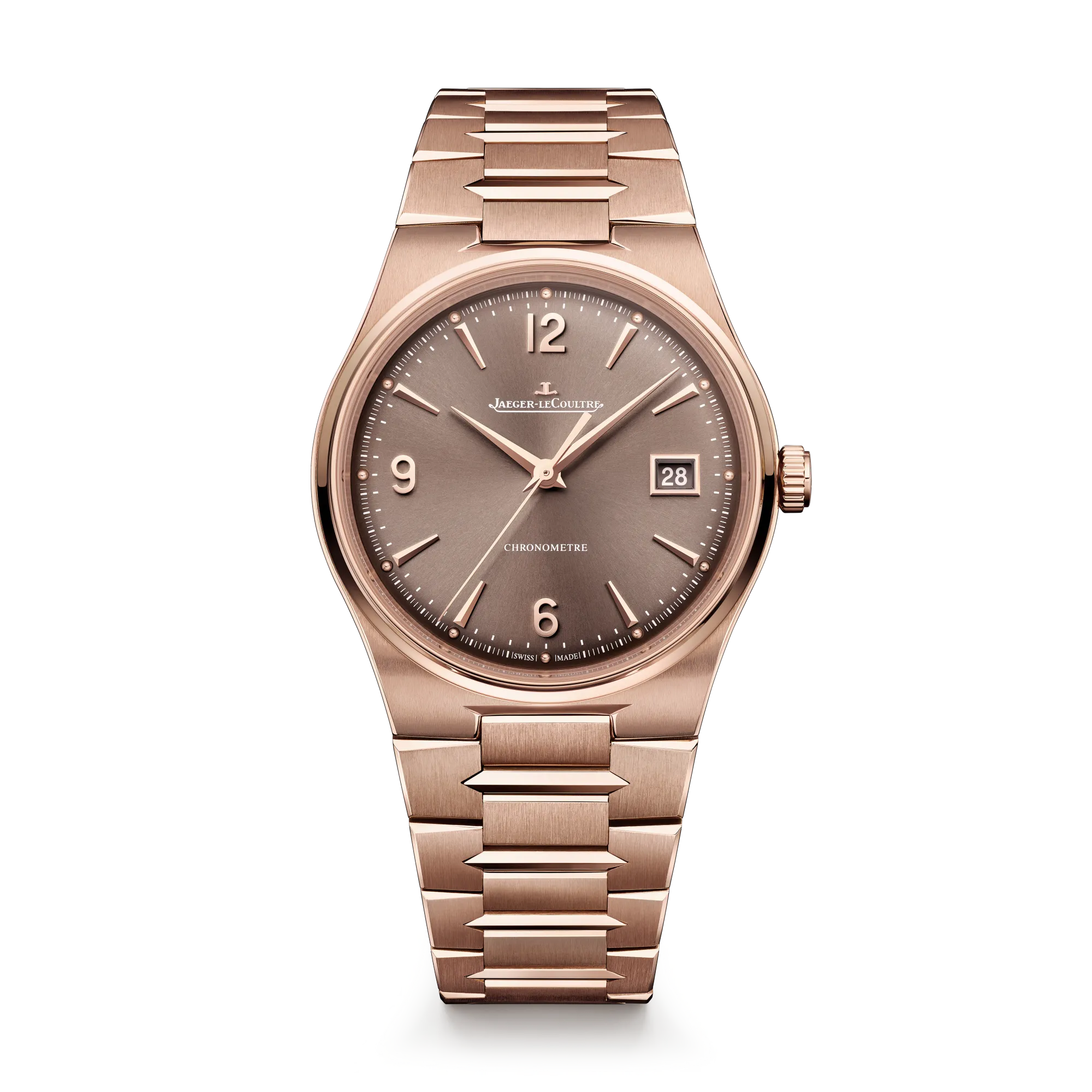 Sportive et élégante à la fois, la Master Control se décline en trois nouvelles versions à commencer par une Master Control Chronometre Date avec un boîtier de 38 mm en or rose (également disponible en acier) et un cadran soleillé bleu-gris ou bronze. Remarquez l’alternance de maillons triangulaires et de surfaces verticales du bracelet intégré qui renvoient à la géométrie des aiguilles Dauphine et des index facettés.