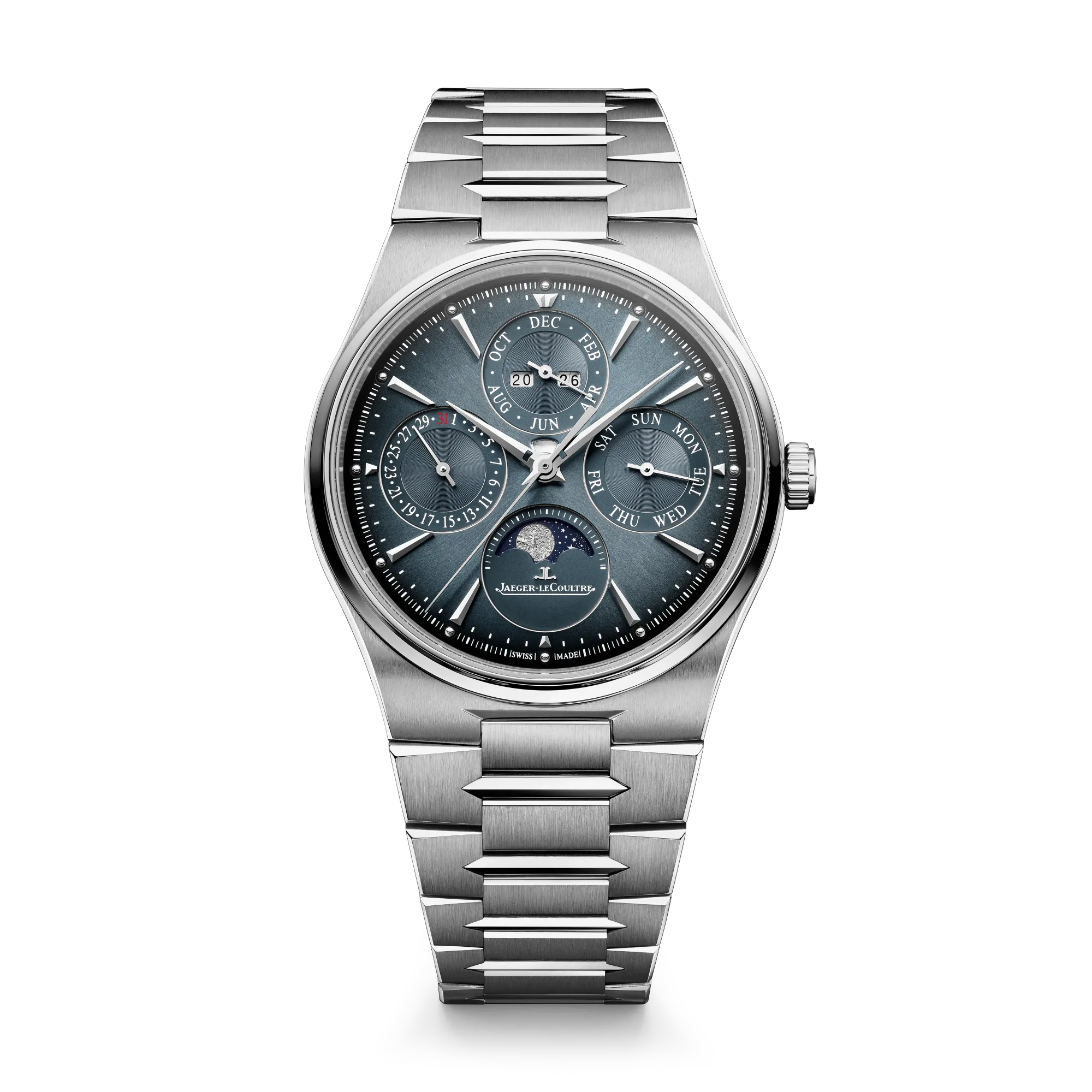 Déclinée en boîtier acier (cadran soleillé dégradé bleu-gris) et or rose (cadran aux tonalités bronze) de 39 mm, la Master Control Chronometre Perpetual Calendar arbore quatre compteurs affichant les mois, la date, le jour et les phases de lune. Ces dernières sont particulièrement fascinantes grâce à des paillons d’or martelés qui leur “apportent profondeur et relief”.