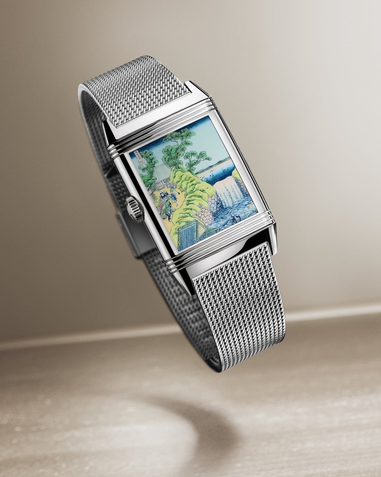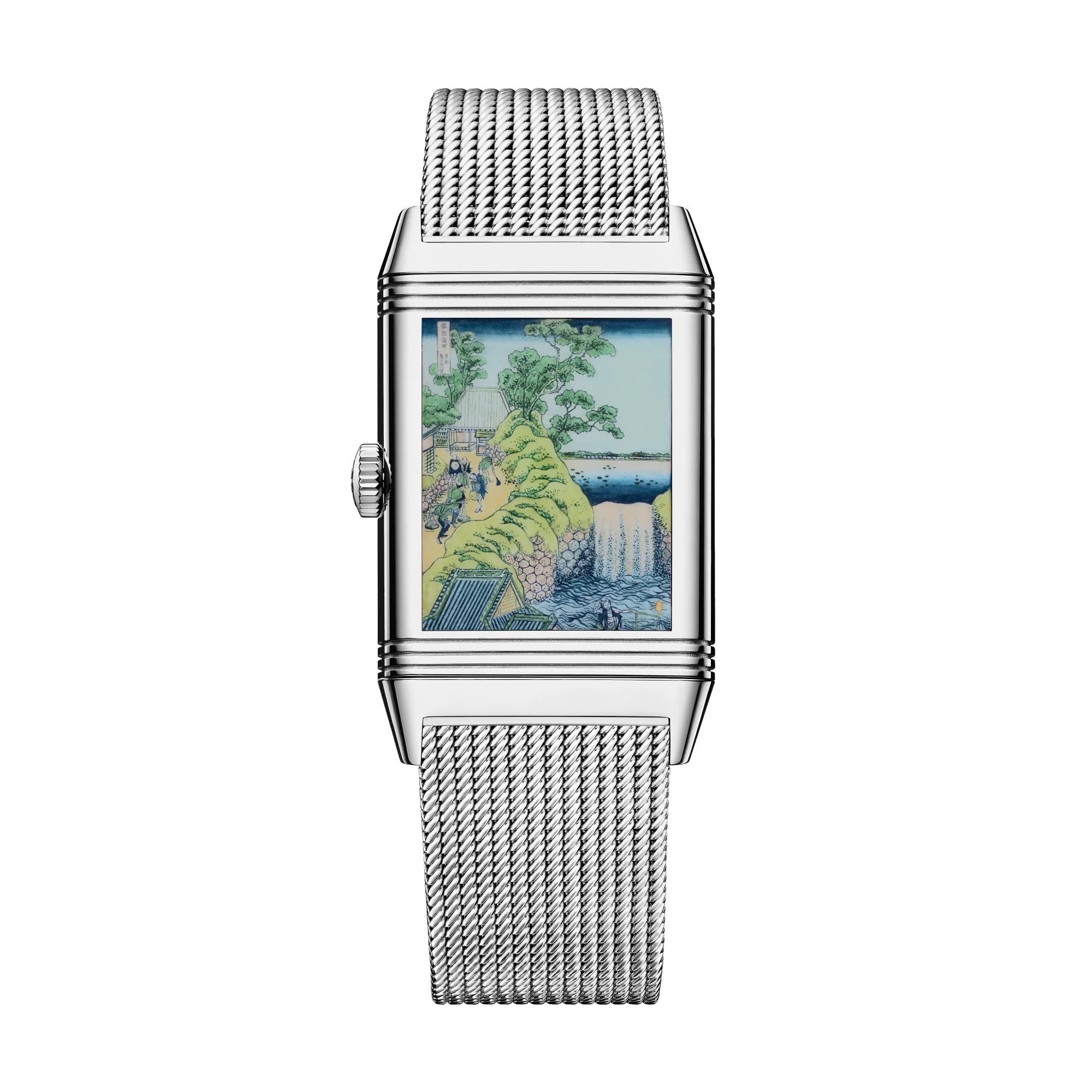 Initiée en 2018, la série de montres Reverso Tribute en hommage à l’œuvre de Katsushika Hokusai se dote de quatre nouvelles références qui reproduisent des miniatures (en émail Grand Feu) de certaines estampes de la série Les Cascades de différentes provinces au verso de cadrans guillochés à la main. Limitée à dix exemplaires par modèle, chacune des Reverso Tribute Enamel Hokusai “Aoigaoka Falls”, “Kiyotaki Kannon Waterfall”, “Rōben Waterfall” et “Yōrō Waterfall” est peinte à la main par des maîtres émailleurs.